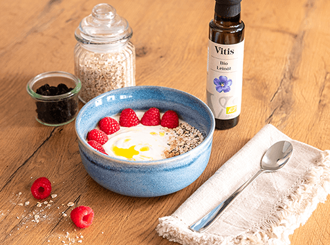 Quark, Joghurt und Müsli: Gib einen Löffel Bio Leinöl zu deinem Müsli oder Joghurt, um deine Mahlzeit mit gesunden Fettsäuren und Antioxidantien zu ergänzen.