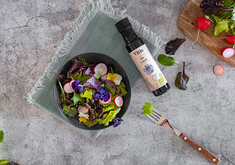 Leinöl-Vinaigrette: Vermische das Bio Leinöl mit Balsamico Essig oder Zitronensaft, würzigem Vitis-Winzersenf, Honig, Salz und Pfeffer zu einer Vinaigrette. Sie schmeckt hervorragend zu Salaten, gedünstetem Gemüse oder als Dressing für Sandwiches.